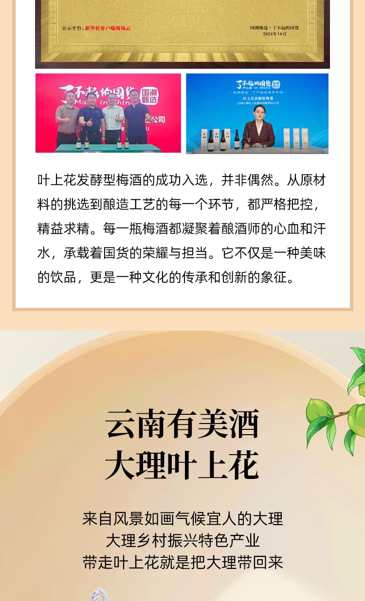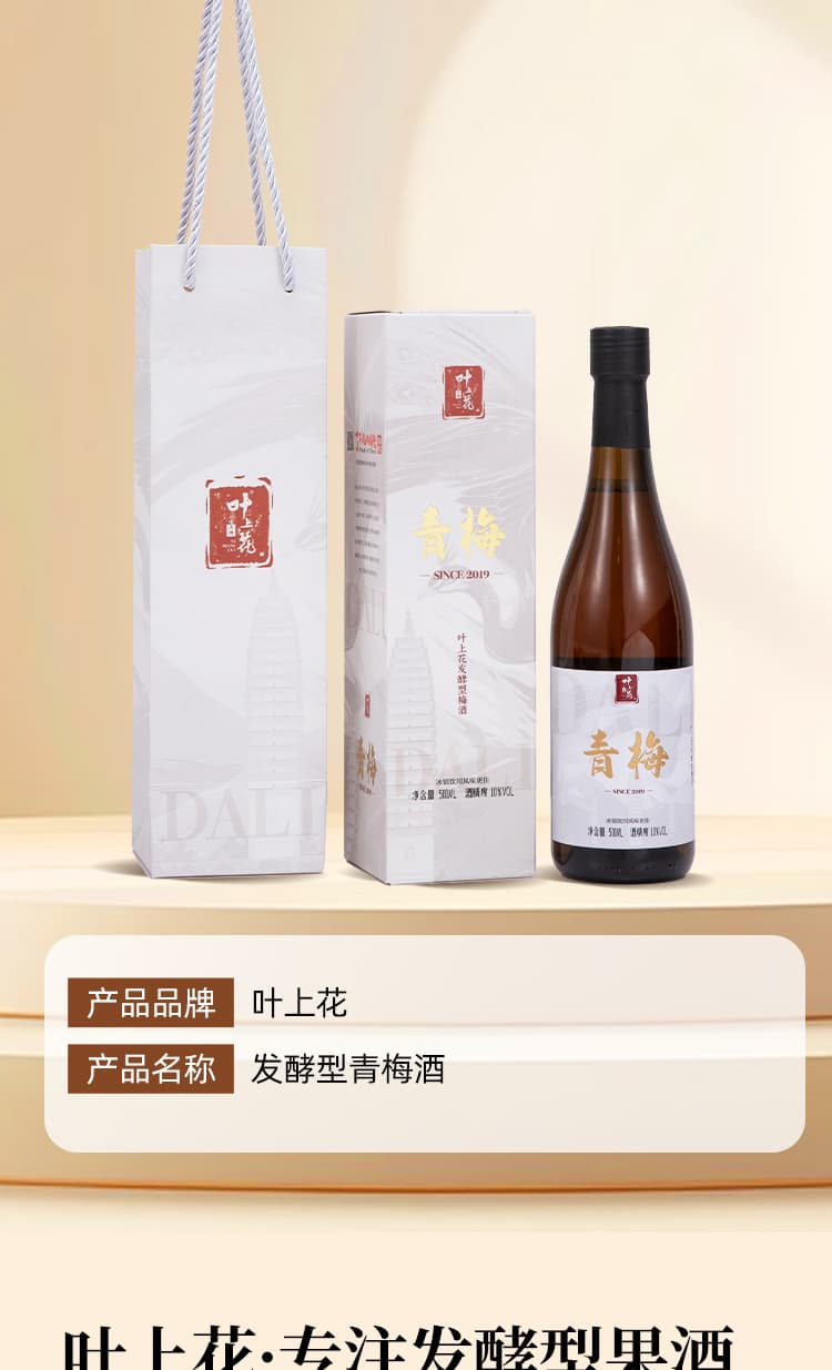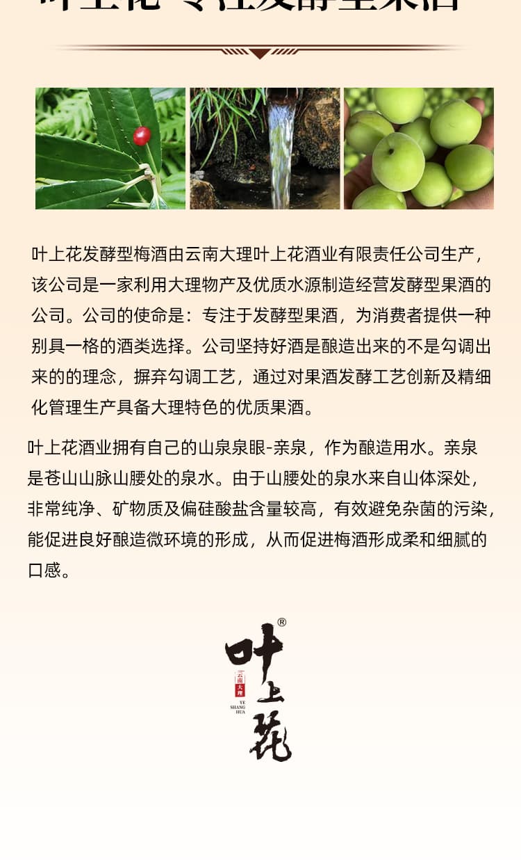 大理叶上花梅酒产自云南大理洱源县,中国最知名的青梅产地,这里海拔高(平均海拔2060米),气候适宜,生态好,本青梅酒均采用本地优质青梅作为发酵原料。