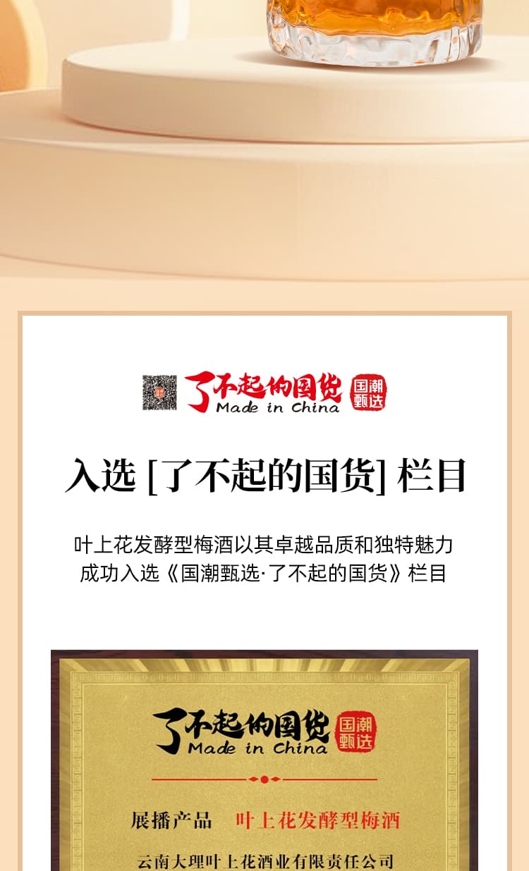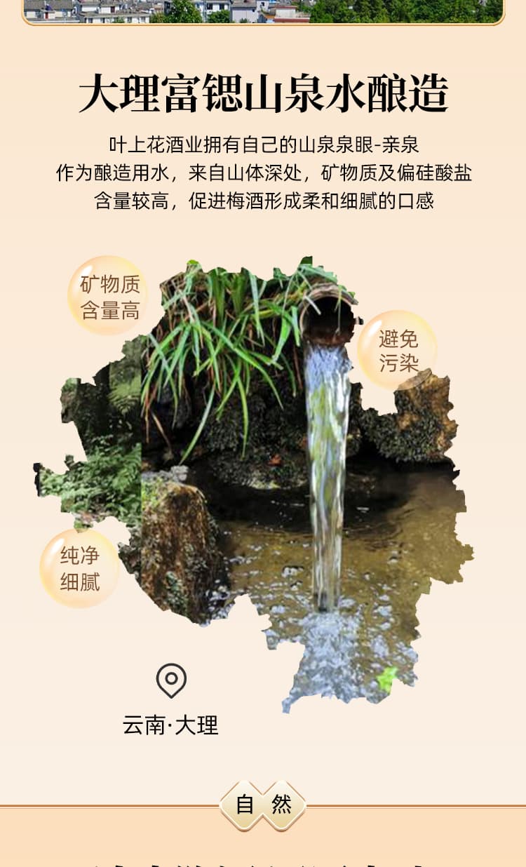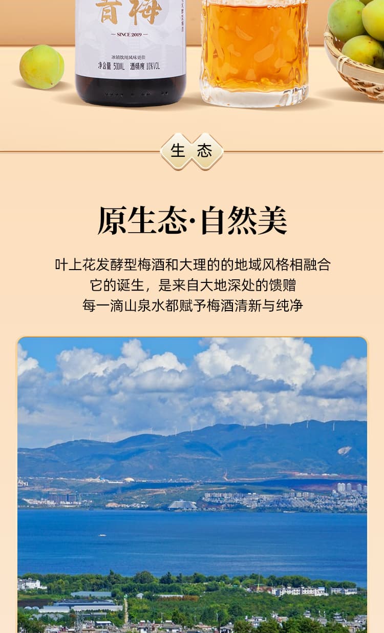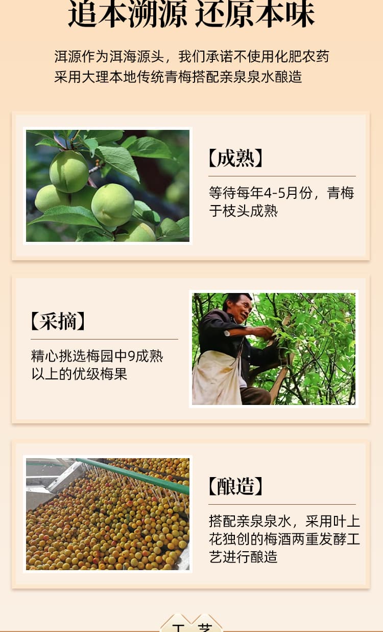 • 梅酒所用之水,为大理苍山山脉洱海源头自然山泉,水质富含多种矿物质,直饮干净清甜。