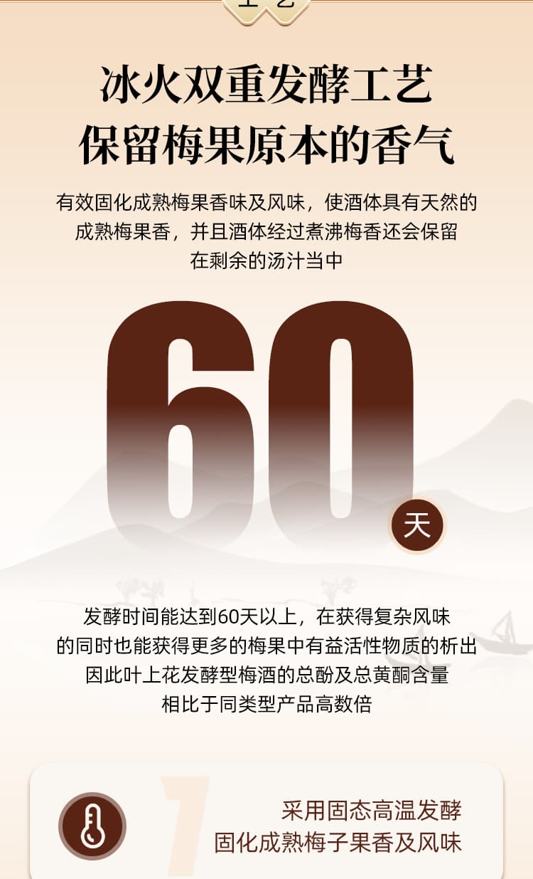 • 营养丰富:通过两重发酵工艺(高温和低温,简称:冰火两重天)发酵,保留梅果中更多的营养物质,如氨基酸等,其含量普遍高于浸泡型青梅酒。