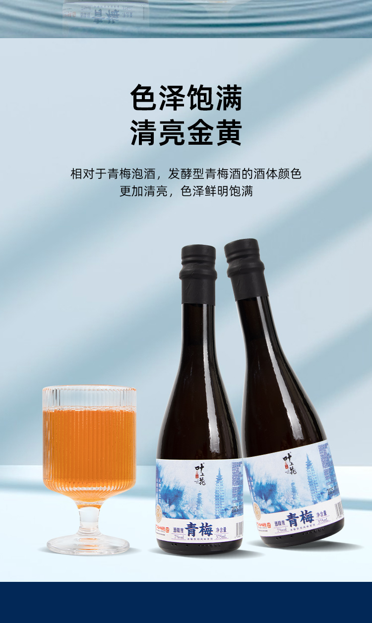 • 色泽饱满:相对于青梅泡酒,发酵型青梅酒的酒体颜色更清亮、金黄、饱满,色泽更鲜明。