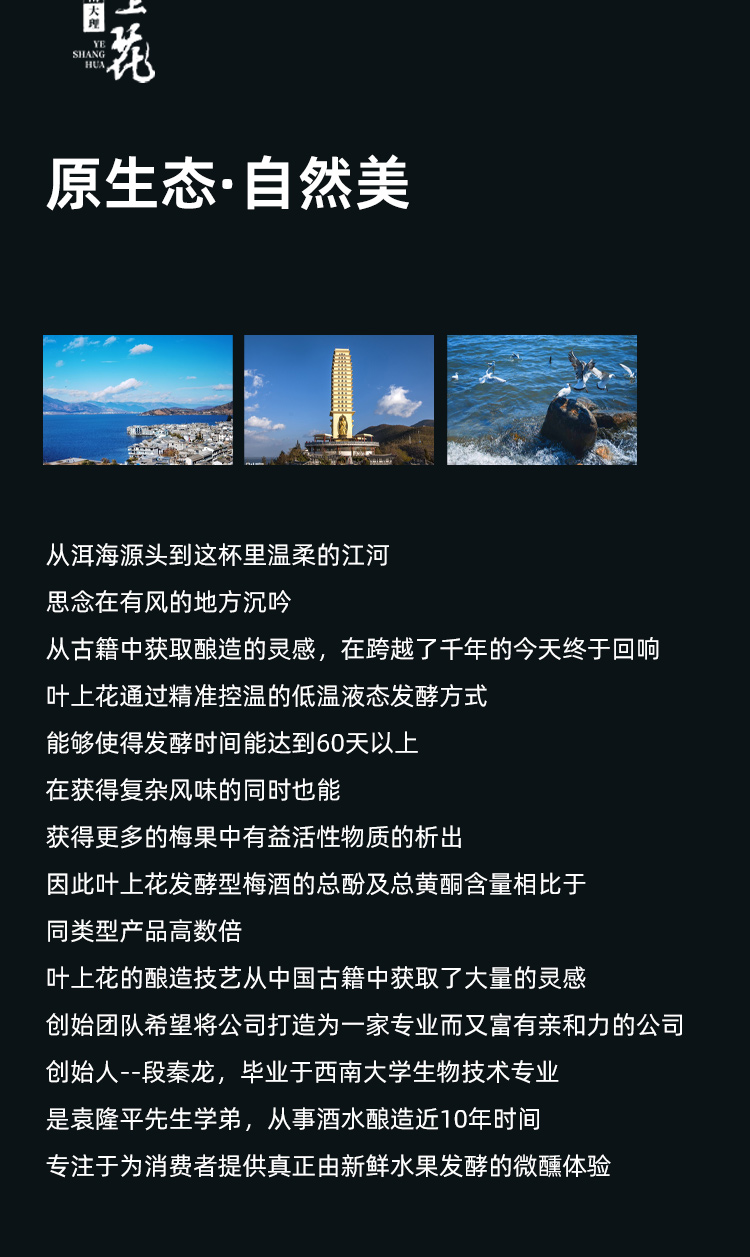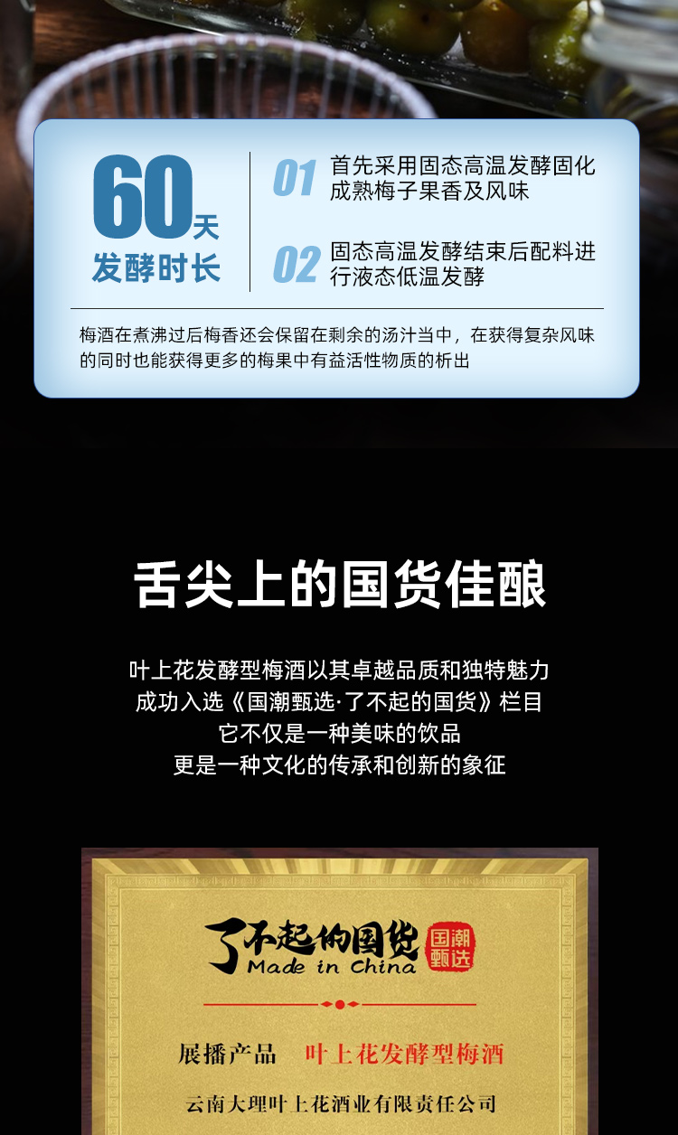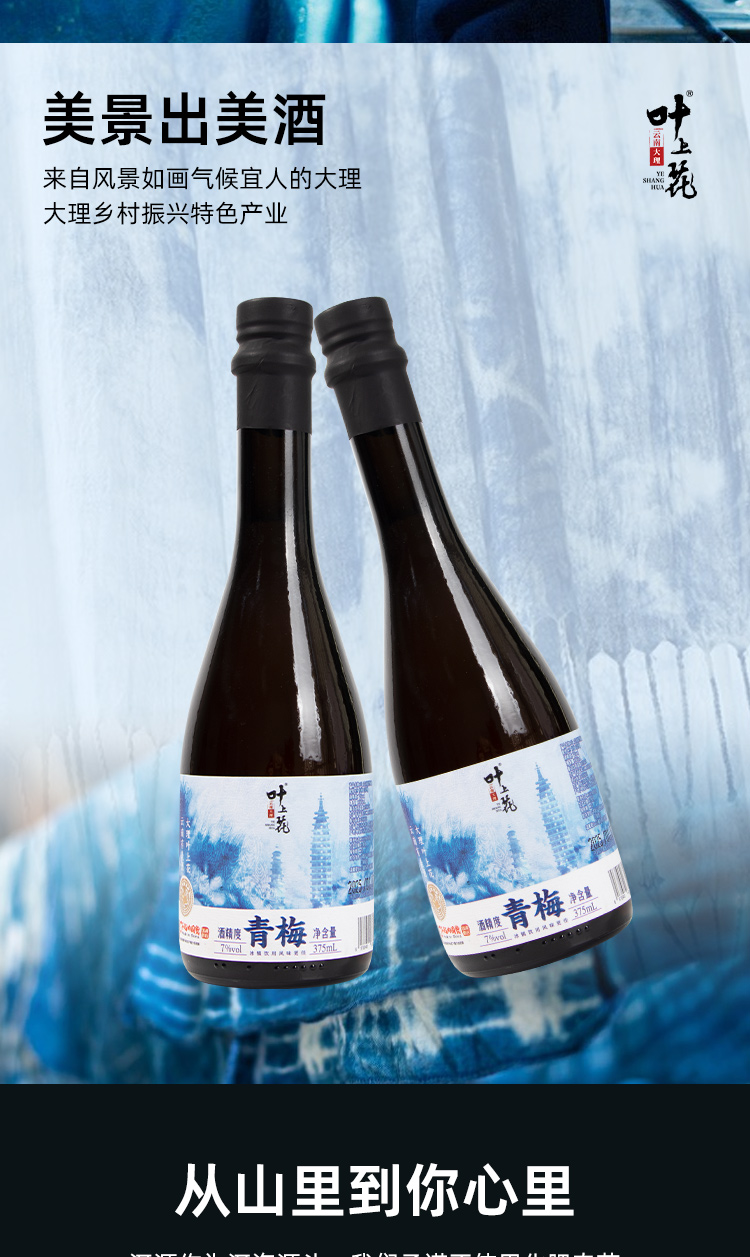 •大理叶上花梅酒产自云南大理洱源县,中国最知名的青梅产地,这里海拔高(平均海拔2060米),气候适宜,生态好,本青梅酒均采用本地优质成熟青梅作为发酵原料。